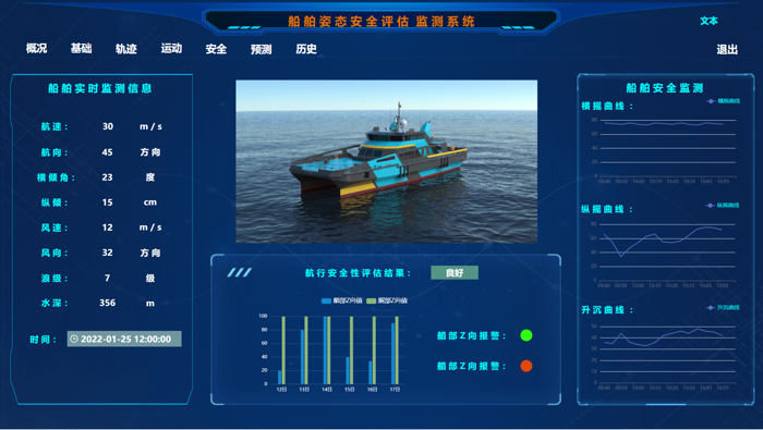 基于智能分析云平臺建立的船舶姿態(tài)安全評估監(jiān)測系統(tǒng)實時監(jiān)測顯示船舶行駛過程中航速、航向等信息,對航行安全性實施評估,如遇危險及時報警,為船舶的安全航行保駕護(hù)航。